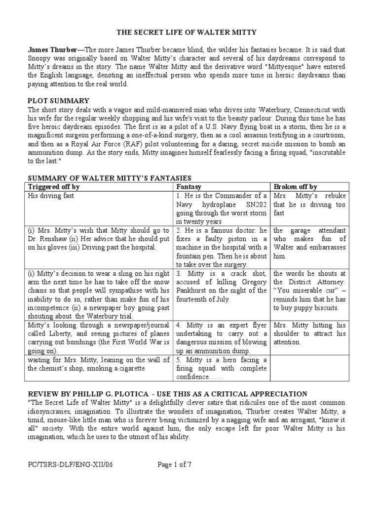 James Thurber is one of Americas best known humorists and The Secret Life of Walter Mitty is his best known story. Critical Overview The Secret Life of Walter Mitty is Thurbers best-known short story. It is this basic idea which is the only thing common between this short story and the movie which was one of the first movies I had seen last year.